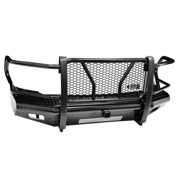 Westins HDX Bandit Bumper combines a heavy duty diamond plate steel bumper constructed of schedule 40 steel pipe with a stylish grille guard featuring 2in. diameter outer wraparound wings and 2 3/4in. wide upright rubber strips. Designed to protect headlights, grille, hood and front fenders from road hazards, debris and wildlife damage. Features a stylish metal honeycomb mesh screen, which allows maximum airflow to the intercooler or radiator area while accenting the front end styling with a clean and rugged look. Removable mesh screens allow for factory camera and adaptive cruise control options available on some late model Ford applications. HDX Bandit Bumper includes a built-in 2in. receiver hitch and (2) heavy duty 9,500 lbs bow shackle mounts, capable of delivering multiple towing options. Compatible for factory fog lamps or LED post mount lights. In addition, some late model Ram and Chevrolet applications feature provisions for factory parking sensors. Bolt-on installation with hardware and mounting brackets included. Available in black powder coat finish.