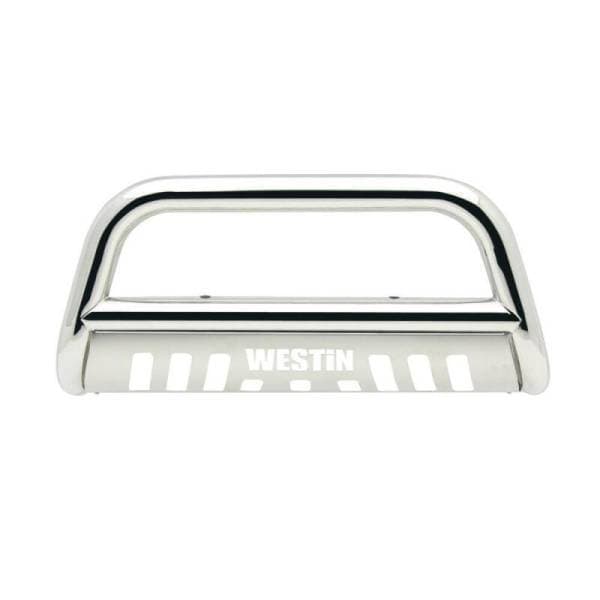 Westins E-Series Bull Bar is a front-end light bar designed for trucks and larger model SUVs. It mounts to the vehicles existing mounting points with no drilling required and comes complete with vehicle specific mount kit. It also features mounting points for 2 auxiliary lights up to 6 inches in diameter. The E-Series Bull Bar features a laser cut Westin block letter logo design on the skid plate. Available in black powder coated e-coated steel with a textured black skid plate backed by a 3 year warranty. Optional license plate bracket is available.