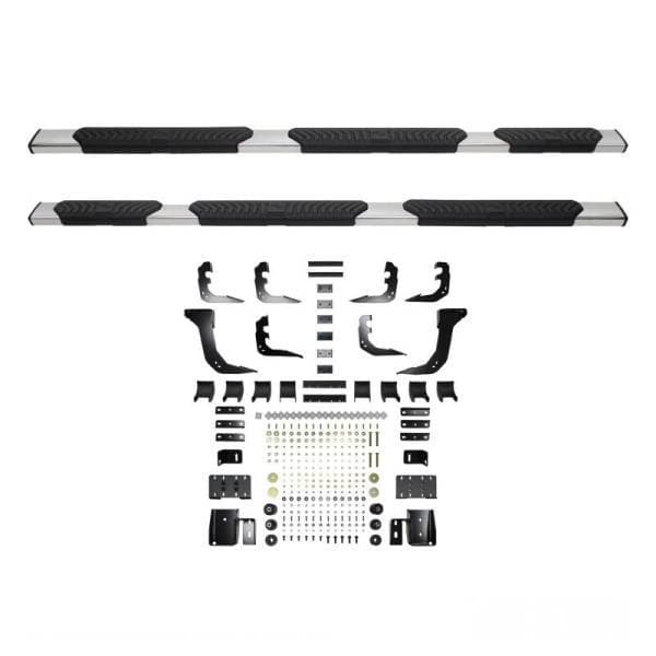 Get a boost, with Westins R5 M-Series Wheel-To-Wheel Nerf Step Bars. The extra wide 5in. footprint step design provides easier and safer vehicle access for both drivers and passengers. Developed and engineered in the USA, the R5 M-Series Wheel-to-Wheel Nerf Step Bars feature three oversized skid resistant step pads allowing easy access to the vehicle cab or truck bed cargo area. Built with high-grade and corrosion resistant steel designed to mount directly to your vehicles existing rocker panels. The modular design saves you money on shipping, as no truck freight costs are required. Also included are injection molded bracket covers for a clean and stylish look. Westins exclusive Isolator Bracket supports the step bar past the truck cab, a feature that competitors do not offer. Without an Isolator Bracket, the step area that extends past the vehicle is left unsupported. Westins unique design provides added bar support without resulting in annoying creaking sounds.