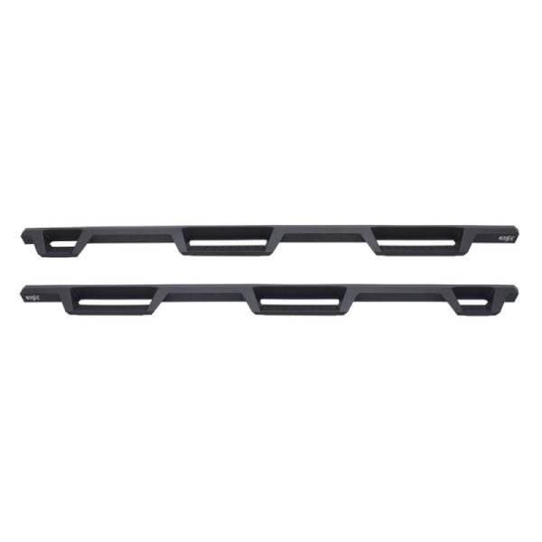 Westins HDX Drop Wheel-to-Wheel Nerf Step Bars feature a notched bar design with a 3rd step location for easy bed access. They provide strong traction with over 2 inches more of toe/heel step area than our Westin's HDX Drop W2W Nerf Step Bars include an added 3rd step location for easier bed area and cargo access. HDX also boasts more than 2 inches of added toe/heel step area which far exceeds all other competitive brands. HDX's notched bar design construction results in a reliable long lasting Bar, with a solid fit and a rugged look. The added length of HDX Drop Wheel-to-wheel Nerf Step Bars provides users with better cab access and better footing and traction for both drivers and passengers. Product includes mount kit and is offered in a variety of vehicle specific applications. Bolt-on installation so no drilling required. Mount kit included. Westin's exclusive Isolator Bracket supports the step bar past the truck cab, a feature that competitors do not offer. Without an Isolator Bracket, the step area that extends past the vehicle is left unsupported. Our unique design provides extra bed support without resulting in annoying creaking sounds.