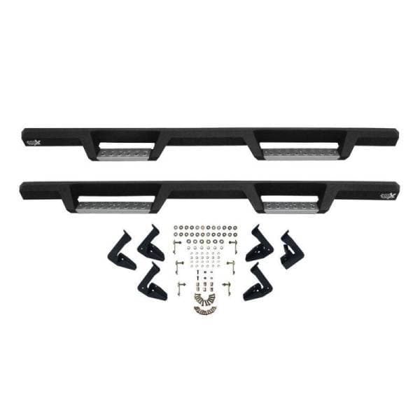 Westin's HDX Stainless Drop Nerf Step Bars are built with corrosion-resistant, textured black painted stainless steel designed to last under the toughest of conditions. With 1-piece construction, these nerf step bars provide over 2 added inches of toe/heel step area than our competitors and fit tight to the vehicle's rocker panel for a solid fit and rugged look. HDX Stainless Drop Nerf Step Bars include stainless steel step pads. Step plates are rust resistant and provide maximum traction. Bolt-on installation with no drilling is required. Includes mount kit.