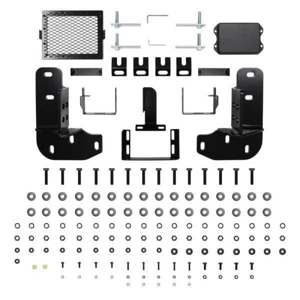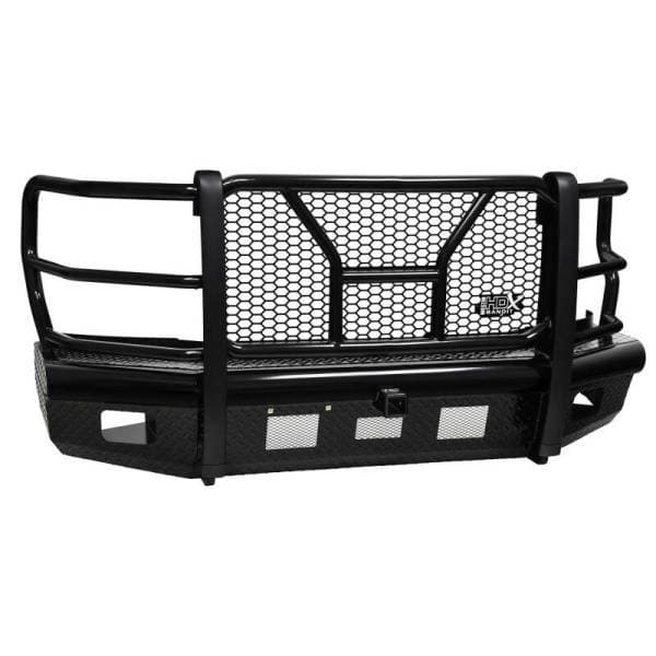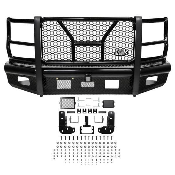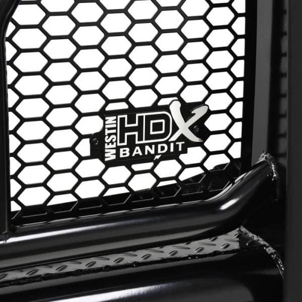 Westins HDX Bandit Bumper combines a heavy duty diamond plate steel bumper constructed of schedule 40 steel pipe with a stylish grille guard featuring 2in. diameter outer wraparound wings and 2 3/4in. wide upright rubber strips. Designed to protect headlights, grille, hood and front fenders from road hazards, debris and wildlife damage. Features a stylish metal honeycomb mesh screen, which allows maximum airflow to the intercooler or radiator area while accenting the front end styling with a clean and rugged look. Removable mesh screens allow for factory camera and adaptive cruise control options available on some late model Ford applications. HDX Bandit Bumper includes a built-in 2in. receiver hitch and (2) heavy duty 9,500 lbs bow shackle mounts, capable of delivering multiple towing options. Compatible for factory fog lamps or LED post mount lights. In addition, some late model Ram and Chevrolet applications feature provisions for factory parking sensors. Bolt-on installation with hardware and mounting brackets included. Available in black powder coat finish.