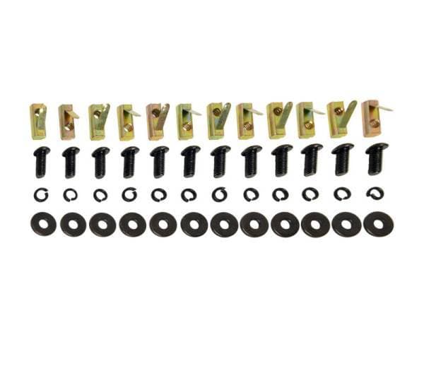 Includes: Yellow Zinc Steel (12) M6 x 1.00 Slide Nut, 12 x 20mm; Black Zinc Stainless (12) M6 x 1.00 x 16mm Button Head Screw; Black Zinc Stainless (12) M6 Split Lock Washer; Black Zinc Stainless (12) M6 Flat Washer 17mm OD, 1.6mm thick; Includes: Yellow Zinc Steel (12) M6 x 1.00 Slide Nut; 12 x 20mm; Black Zinc Stainless (12) M6 Flat Washer 17mm OD; 1.6mm thick
